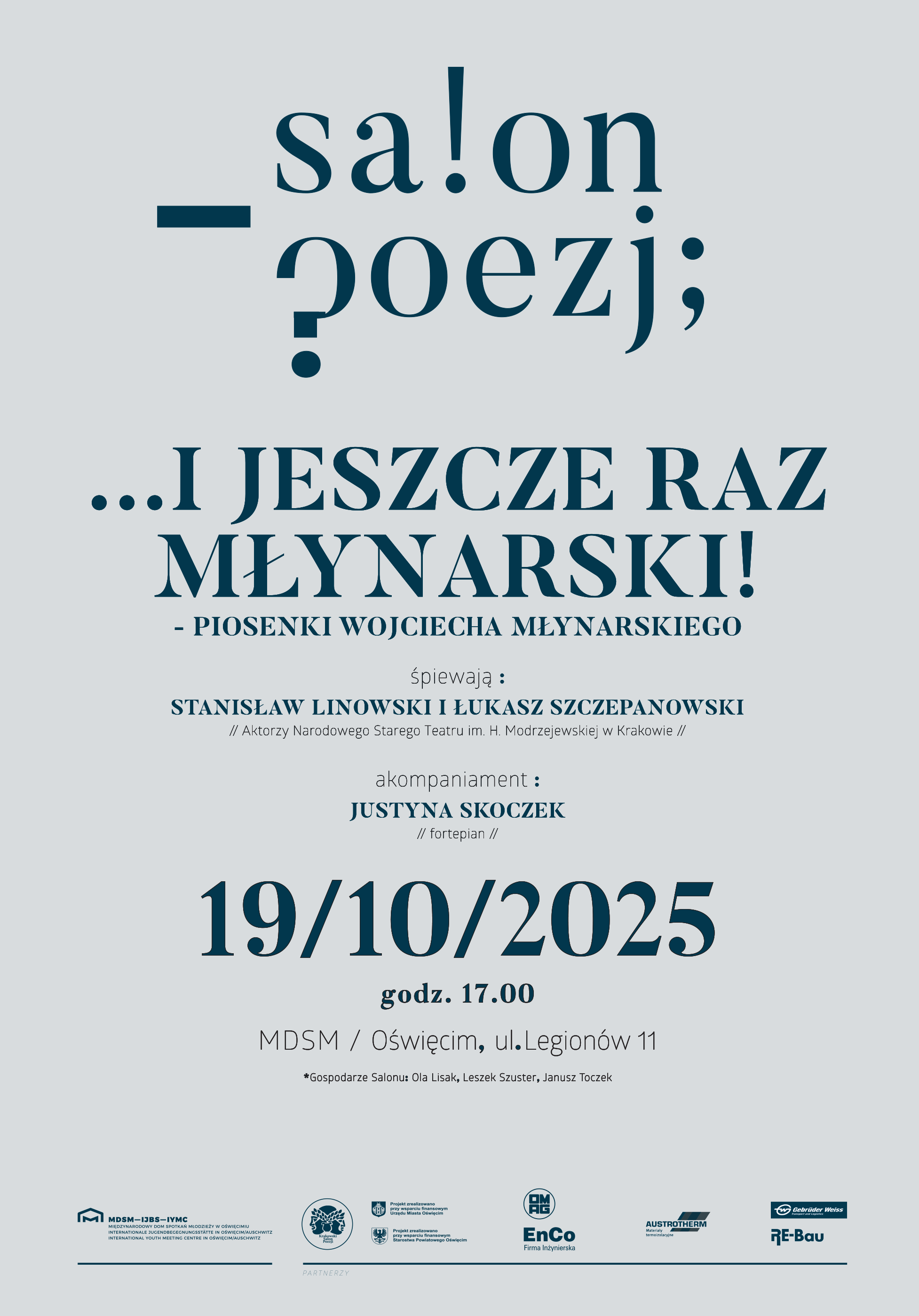 Międzynarodowy Dom Spotkań Młodzieży w Oświęcimiu zaprasza na 94. Krakowski Salon Poezji w MDSM pt. "…I JESZCZE RAZ MŁYNARSKI!” który odbędzie się 19 października (niedziela) o godzinie 17.00. Piosenki Wojciecha Młynarskiego zaśpiewają Stanisław Linowski i Łukasz Szczepanowski, aktorzy Narodowego Starego Teatru im. H. Modrzejewskiej w Krakowie. Oprawa muzyczna: Justyna Skoczek (fortepian).