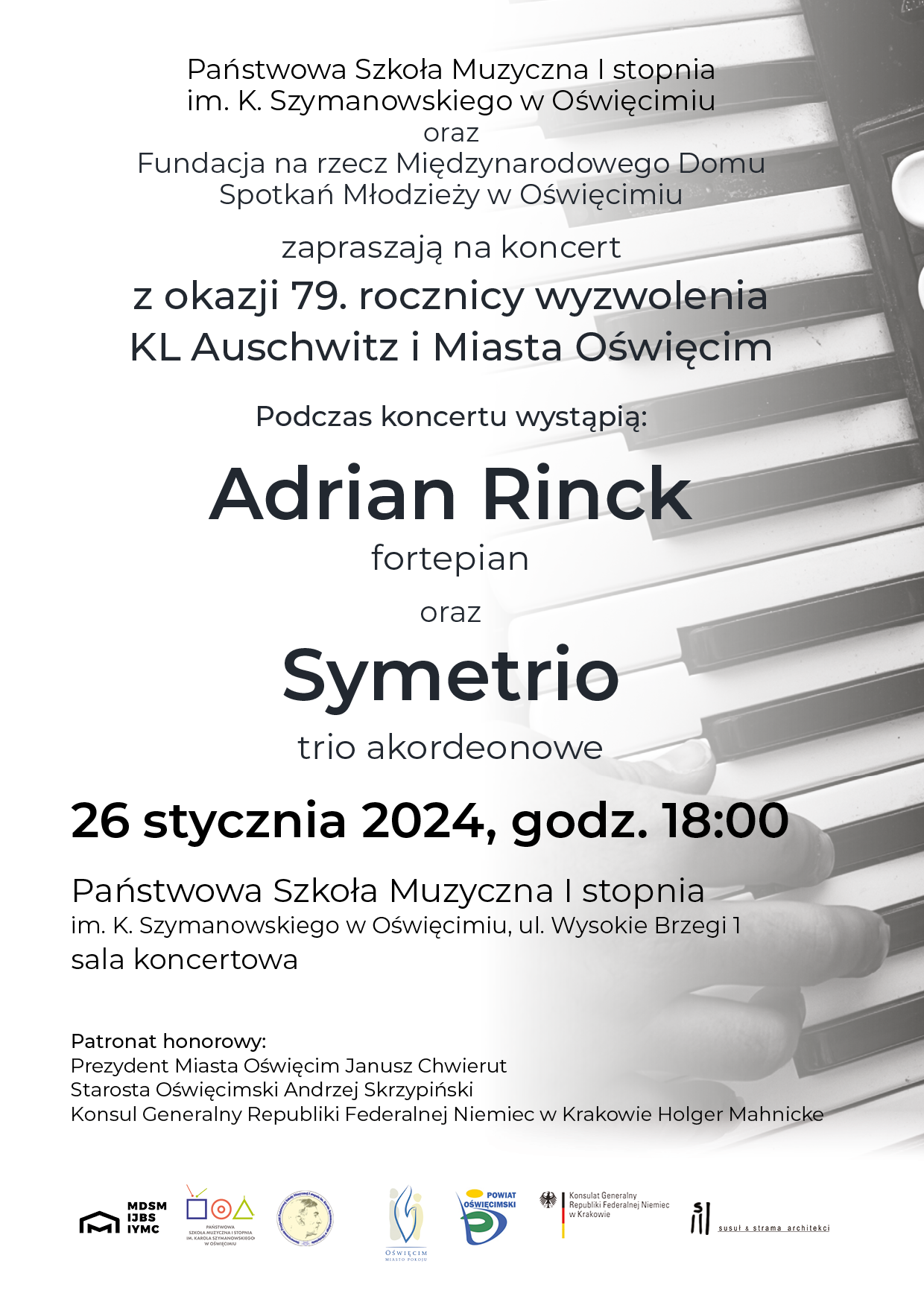 Państwowa Szkoła Muzyczna I stopnia im. K. Szymanowskiego w Oświęcimiu oraz Fundacja na rzecz Międzynarodowego Domu Spotkań Młodzieży w Oświęcimiu zapraszają na koncert z okazji 79. rocznicy wyzwolenia KL Auschwitz i Miasta Oświęcim.