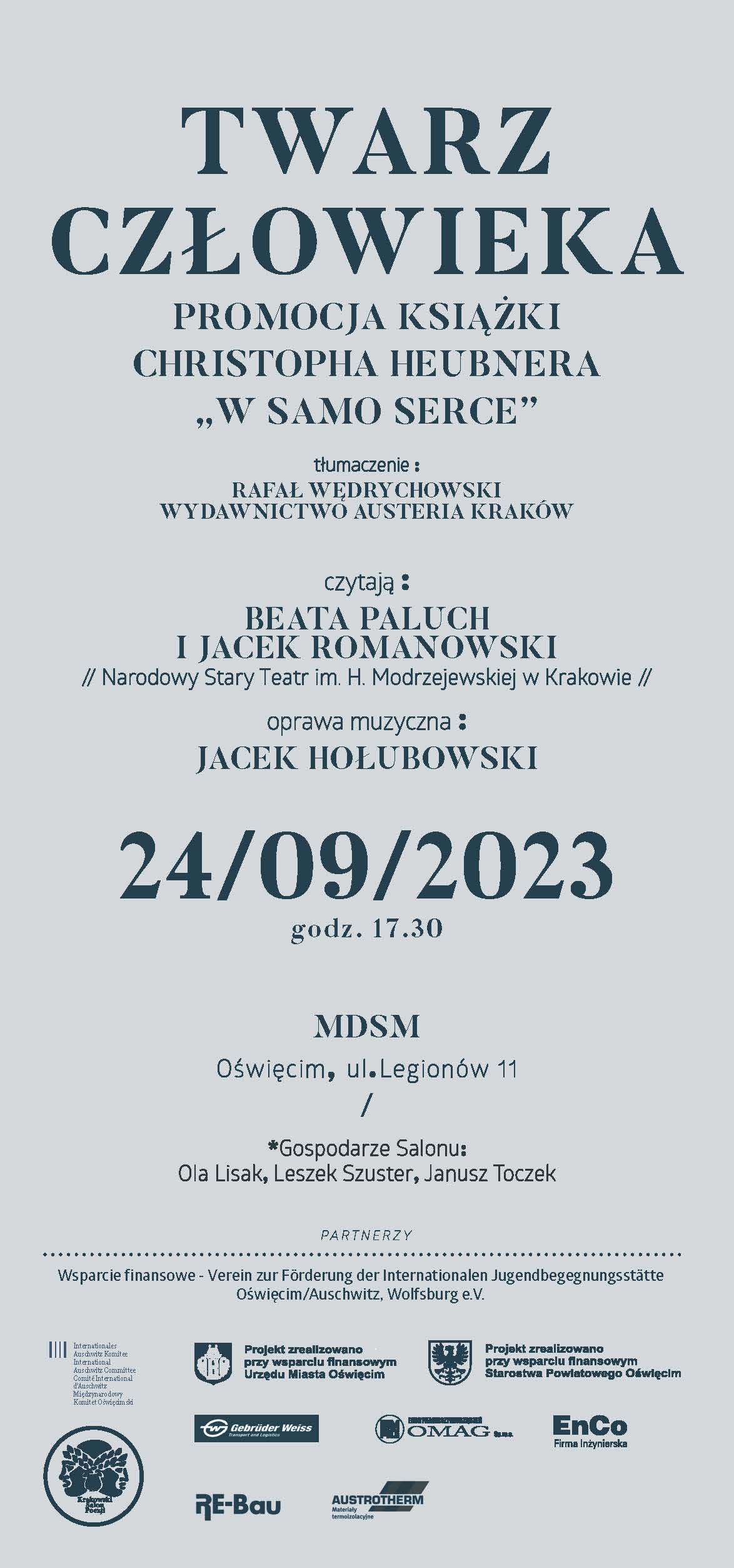 24 września 2023 r. o godzinie 17.30 zapraszamy na 87. Krakowski Salon Poezji w MDSM pt. "Twarz Człowieka". Podczas wieczoru Beata Paluch i Jacek Romanowski (Narodowy Stary Teatr im. H. Modrzejewskiej w Krakowie) zaprezentują fragmenty książki Christopha Heubnera „W samo serce”. Oprawę muzyczną zapewni Jacek Hołubowski. W drugiej części programu zapraszamy na rozmowę z autorem książki, Christophem Heubnerem oraz tłumaczem tekstu, Rafałem Wędrychowskim.